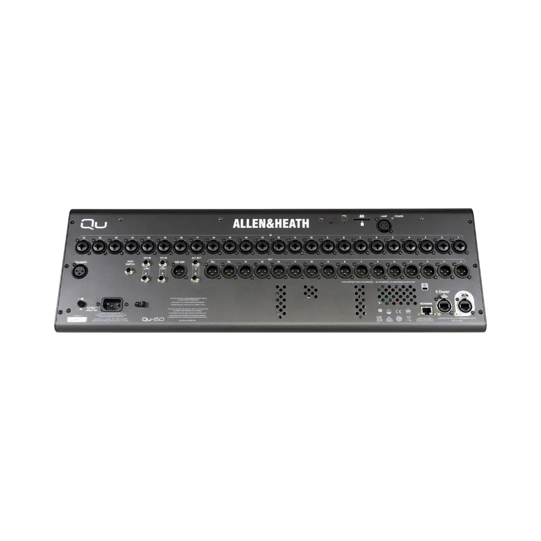 The Allen & Heath Qu-6D digital mixer is a compact 38-input, 24-output 96kHz mixing console featuring the powerful XCVI processing core and integrated Dante audio networking. Designed for live sound, studio recording, and installed audio systems, the Qu-6D delivers pristine sound quality, advanced control, and flexible system expansion.