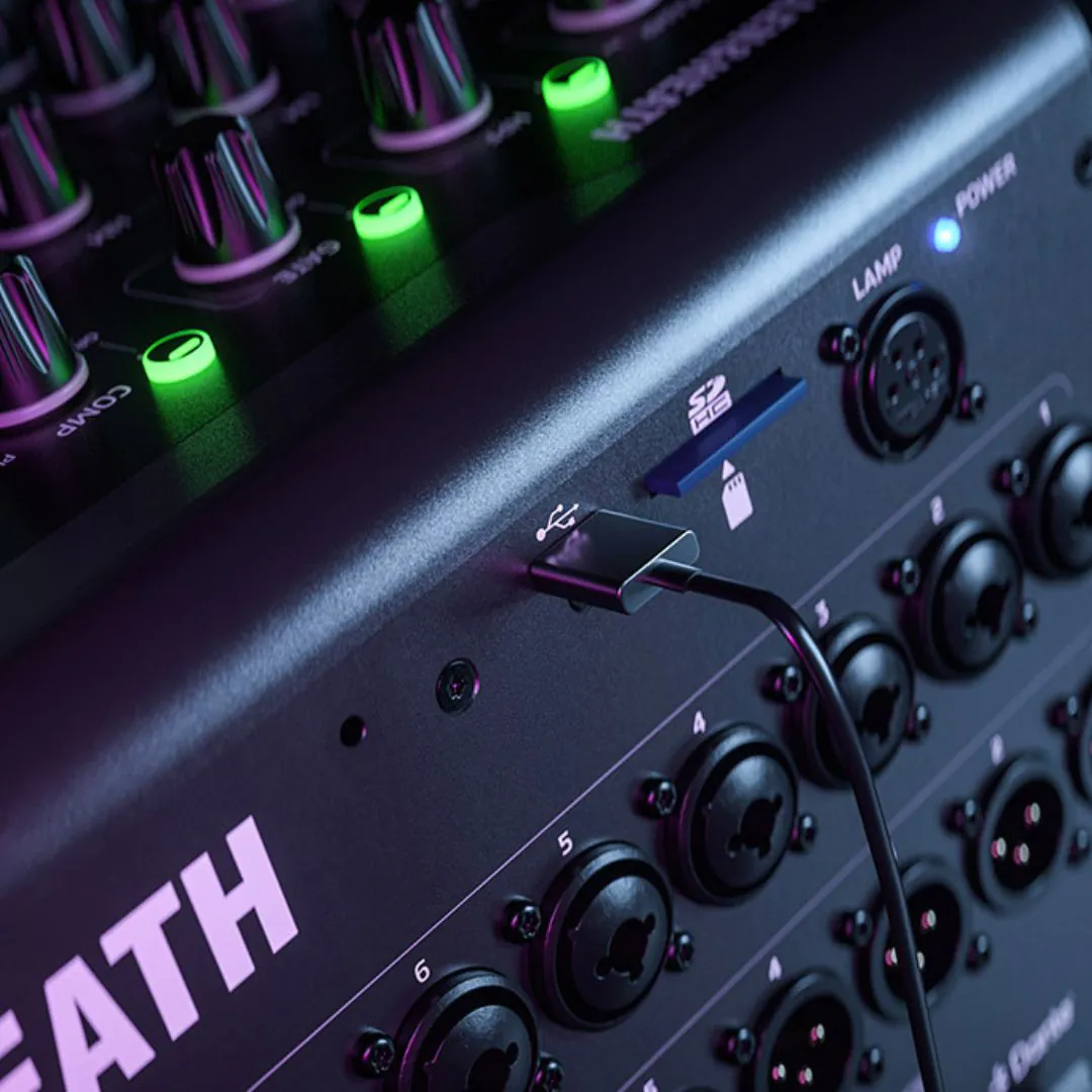 Its enhanced control surface includes a responsive 7-inch touchscreen, motorised faders, high-visibility channel displays, and four customisable layers for quick, intuitive walk-up mixing. Recording and playback are highly flexible with a 32×32 USB-C audio interface, SD card multitrack recording, and USB-A stereo capture, supporting a wide range of live and studio workflows.