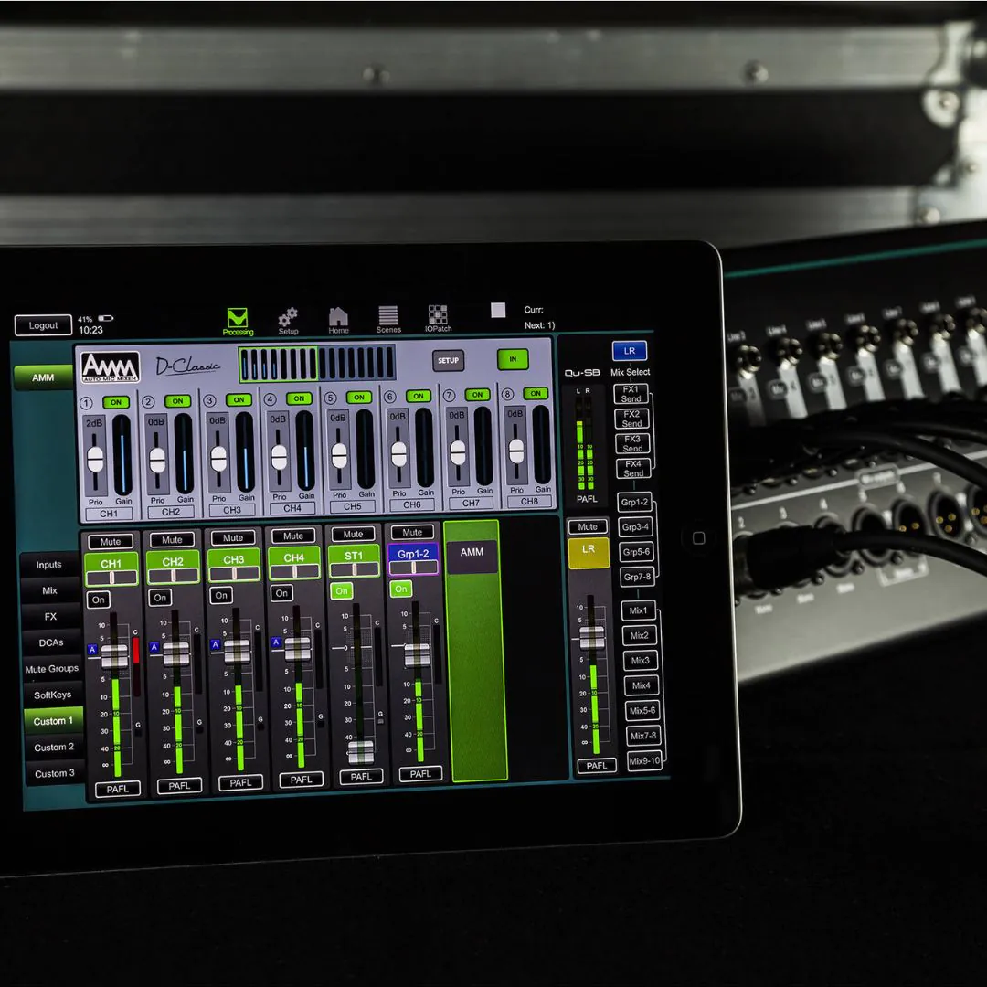 The Qu-Pad iPad app allows complete wireless control of the Qu-SB from anywhere in the venue. Engineers can adjust levels, EQ, dynamics, and effects in real time without being tied to a fixed location. The built-in Automatic Mic Mixer (AMM) intelligently manages multiple open microphones. This reduces feedback, ambient noise, and mic spill during conferences or panel discussions. The combination ensures clear, professional sound in complex live environments.