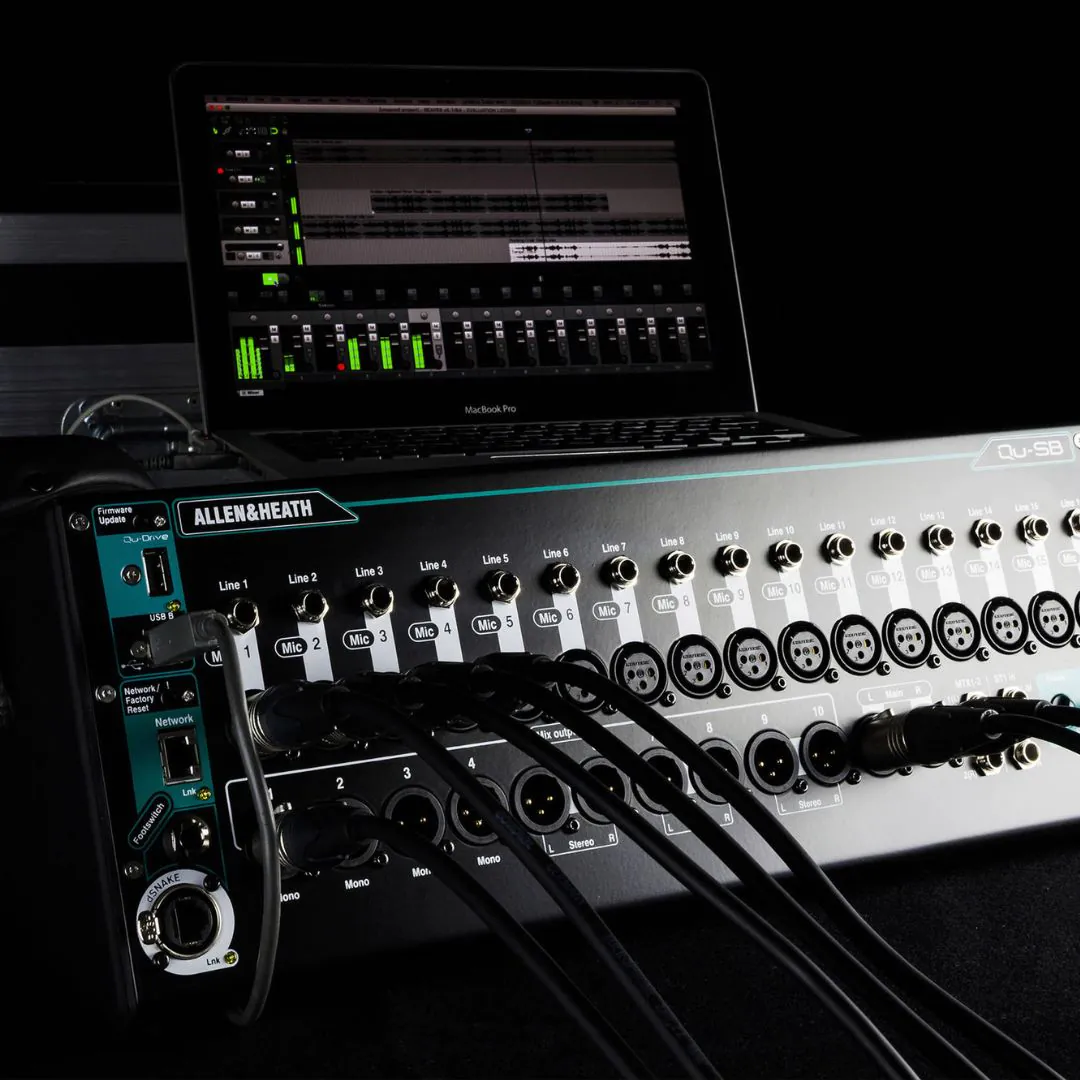 The Allen & Heath Qu-SB digital mixer is a compact yet powerful 18-input / 14-output digital mixing console engineered for professional live sound, touring, broadcasting, and portable studio recording, delivering premium audio quality, wireless control, and computer-free multitrack recording.