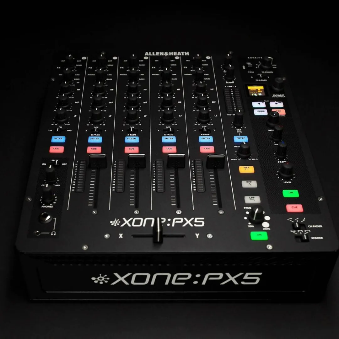 The Allen & Heath XONE:PX5 DJ mixer is a professional 4+1 channel analog mixer with an integrated 20-channel USB sound card, advanced XONE analog filtering, and built-in XONE:FX effects, making it ideal for club DJs, home studios, and live performance environments.