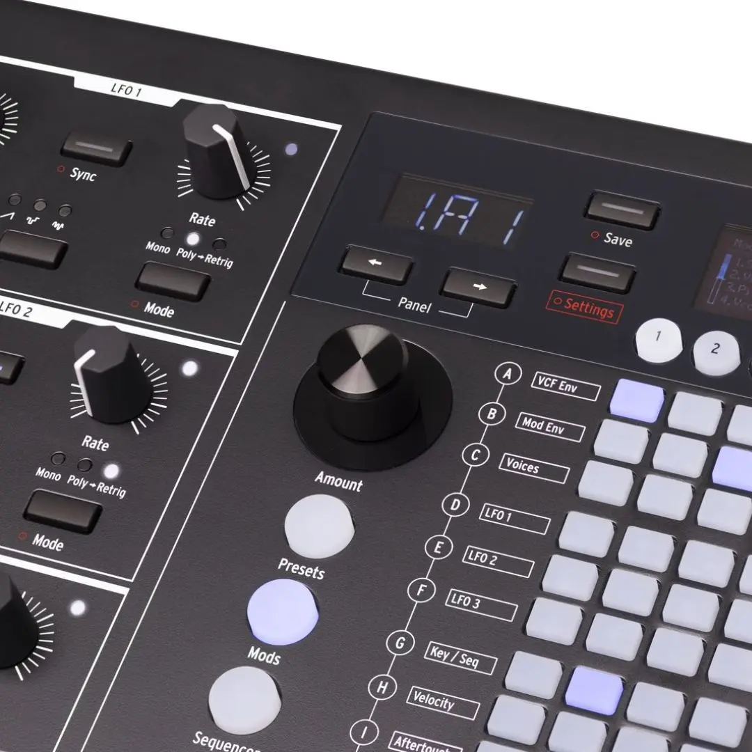 With three envelope generators (two ADSR and one DADSR) and three syncable LFOs, PolyBrute offers extensive modulation options. The 12x32 modulation matrix allows flexible signal routing, enabling users to assign performance controllers and modulation sources to various parameters for complex and evolving sounds.