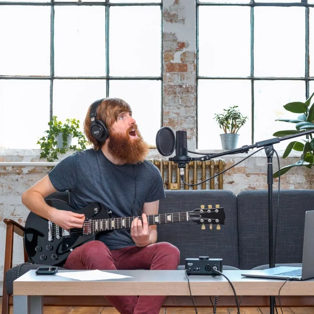 The Audient EVO Start Recording Bundle includes everything you need: EVO 4 audio interface, SR1 condenser microphone with shockmount, SR2000 headphones, and XLR cable—perfect for home studios and content creation.