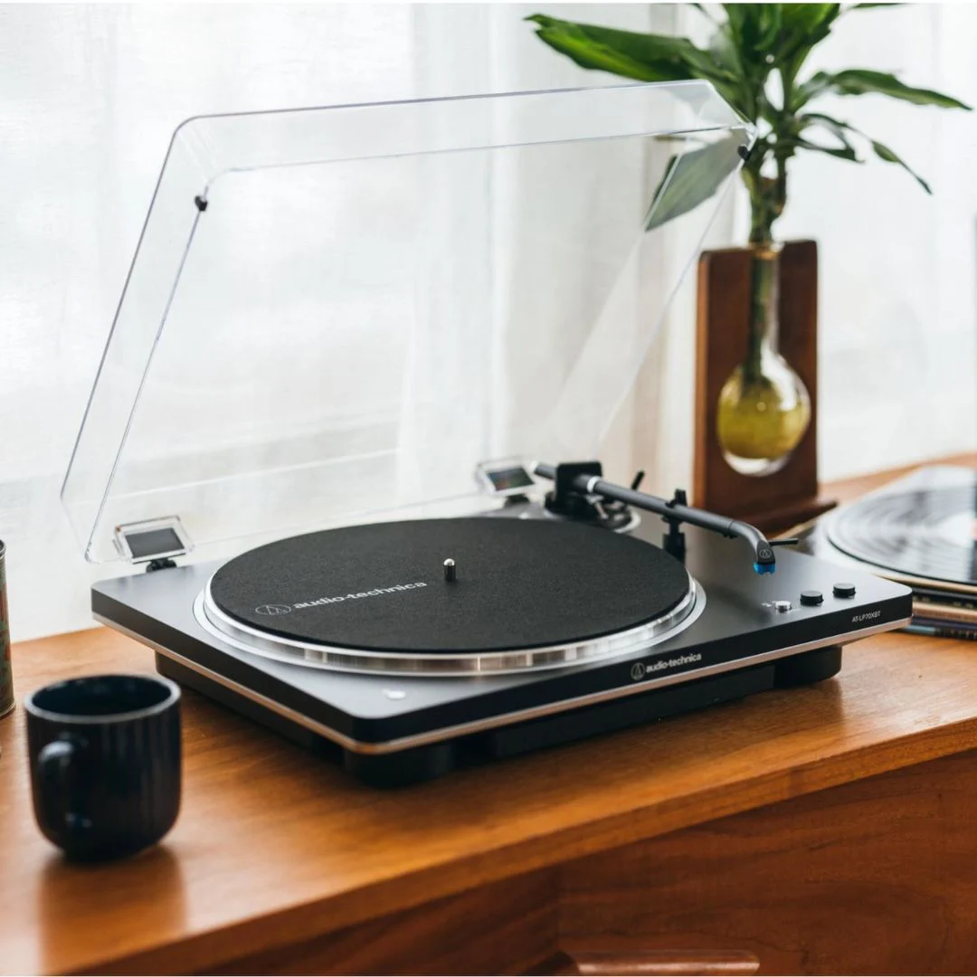 The Audio-Technica AT-LP70XBT turntable offers high-fidelity vinyl playback with Bluetooth connectivity, improved sound quality, and a built-in phono preamp for versatile connection. It features the AT-VM95C cartridge on a J-shaped tonearm, upgradeable stylus options, and a noise-reducing anti-resonance chassis, making it perfect for both beginners and audiophiles.