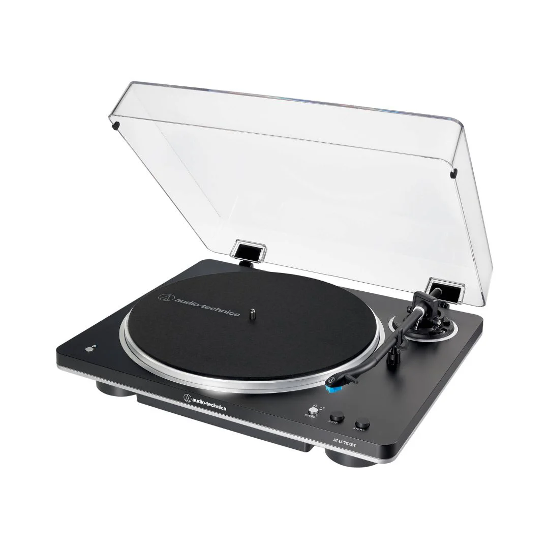 The Audio-Technica AT-LP70XBT turntable offers high-fidelity vinyl playback with Bluetooth connectivity, improved sound quality, and a built-in phono preamp for versatile connection. It features the AT-VM95C cartridge on a J-shaped tonearm, upgradeable stylus options, and a noise-reducing anti-resonance chassis, making it perfect for both beginners and audiophiles.
