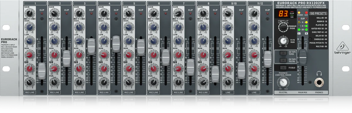 The Behringer RX1202FXV2 is a professional 12-input rack-mountable mic/line mixer designed for live sound, installations, and studio sub-mixing applications. Built with 8 studio-grade XENYX microphone preamps, this compact mixer delivers warm, low-noise performance with outstanding clarity—ideal for vocals, instruments, and spoken-word applications.