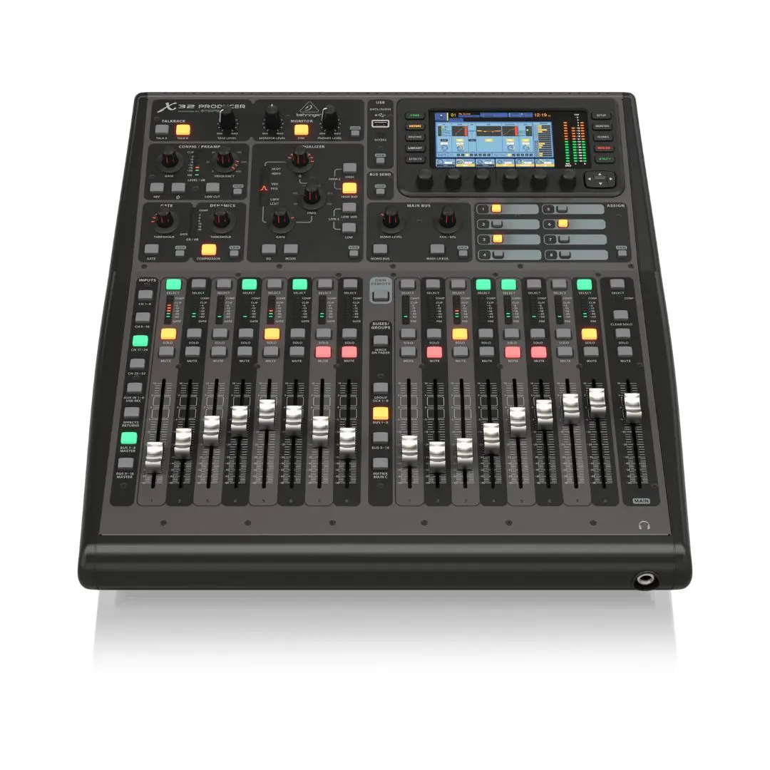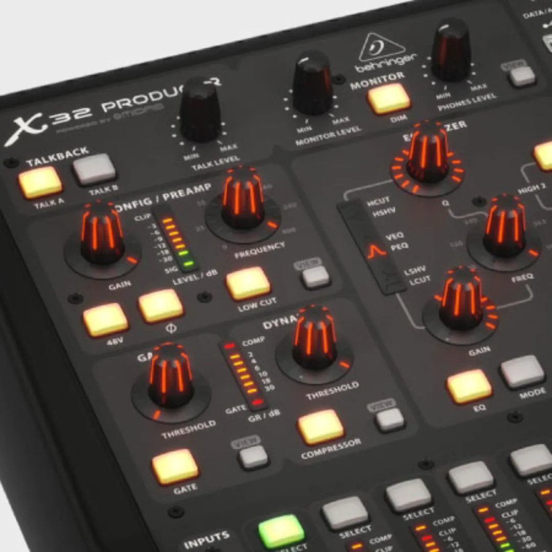 The Behringer X32 PRODUCER is a compact yet powerful 40-channel, 25-bus digital mixing console, designed for both professional live sound and studio recording applications. It features 16 fully programmable MIDAS-designed mic preamps and comprehensive onboard processing, including 6-band parametric EQs and dynamics on all main outputs and mix buses, alongside integrated 32×32 USB audio interface capabilities.
