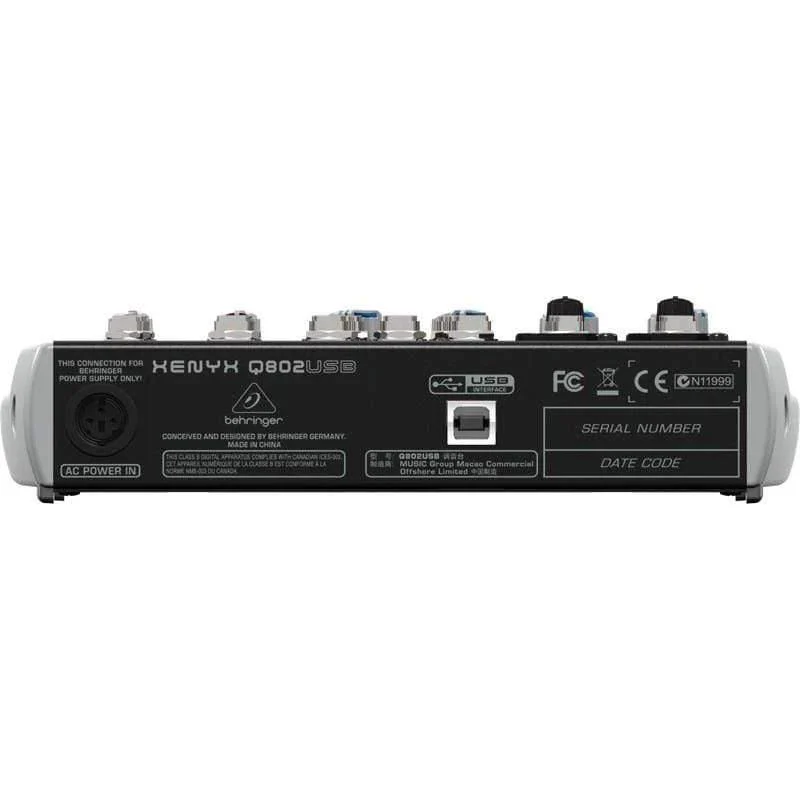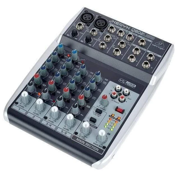The Behringer Xenyx Q802USB Analog Mixer is a compact yet powerful 8-input USB mixer designed for musicians, streamers, podcasters, and home-studio creators who need professional sound in a portable format. Featuring 2 studio-grade XENYX microphone preamps, ultra-musical British-style EQ, and intuitive one-knob compressors, the Q802USB delivers clear, punchy, and balanced audio for both live and recording applications.