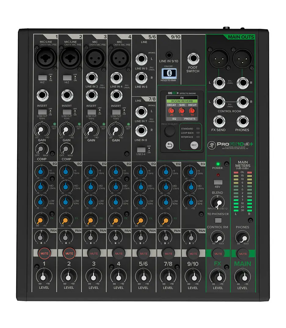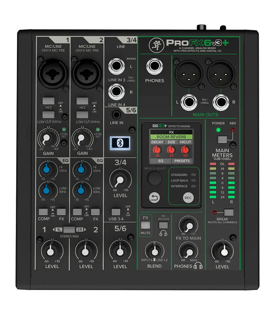The mixer provides two combo XLR-1/4" inputs with phantom power and dedicated ToneMatch presets for instruments and microphones. A third channel offers 1/4" and 3.5mm inputs plus Bluetooth streaming. This integrated mixer simplifies connectivity for mics, instruments, and backing tracks, eliminating the need for an external board.