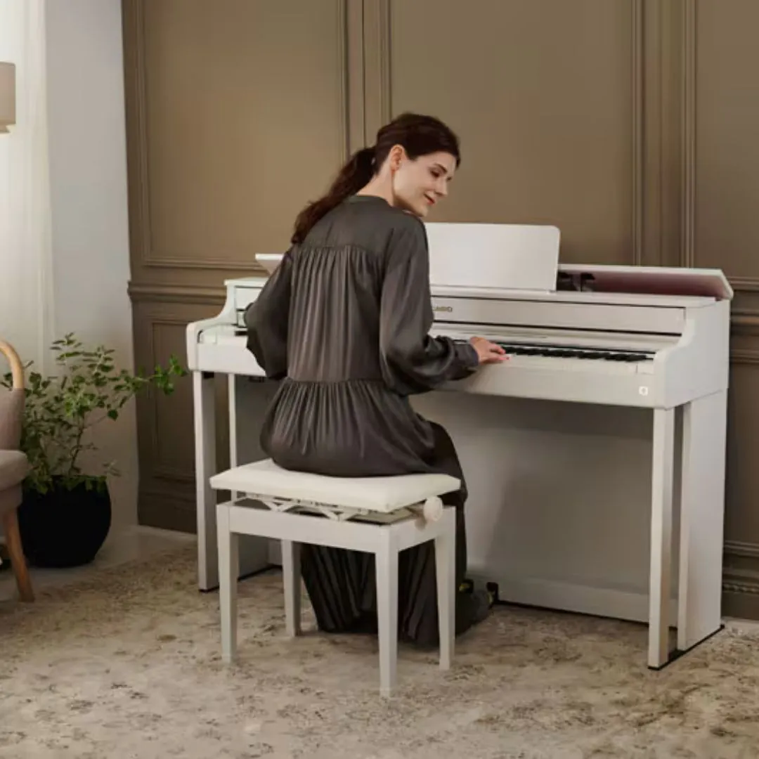 The Casio Celviano AP-300 Console Digital Piano – White blends authentic weighted key feel, rich AiR grand sound, immersive speakers, and advanced connectivity (Bluetooth & USB) in an elegant console design — ideal for home, studio, and music-learning settings.Home