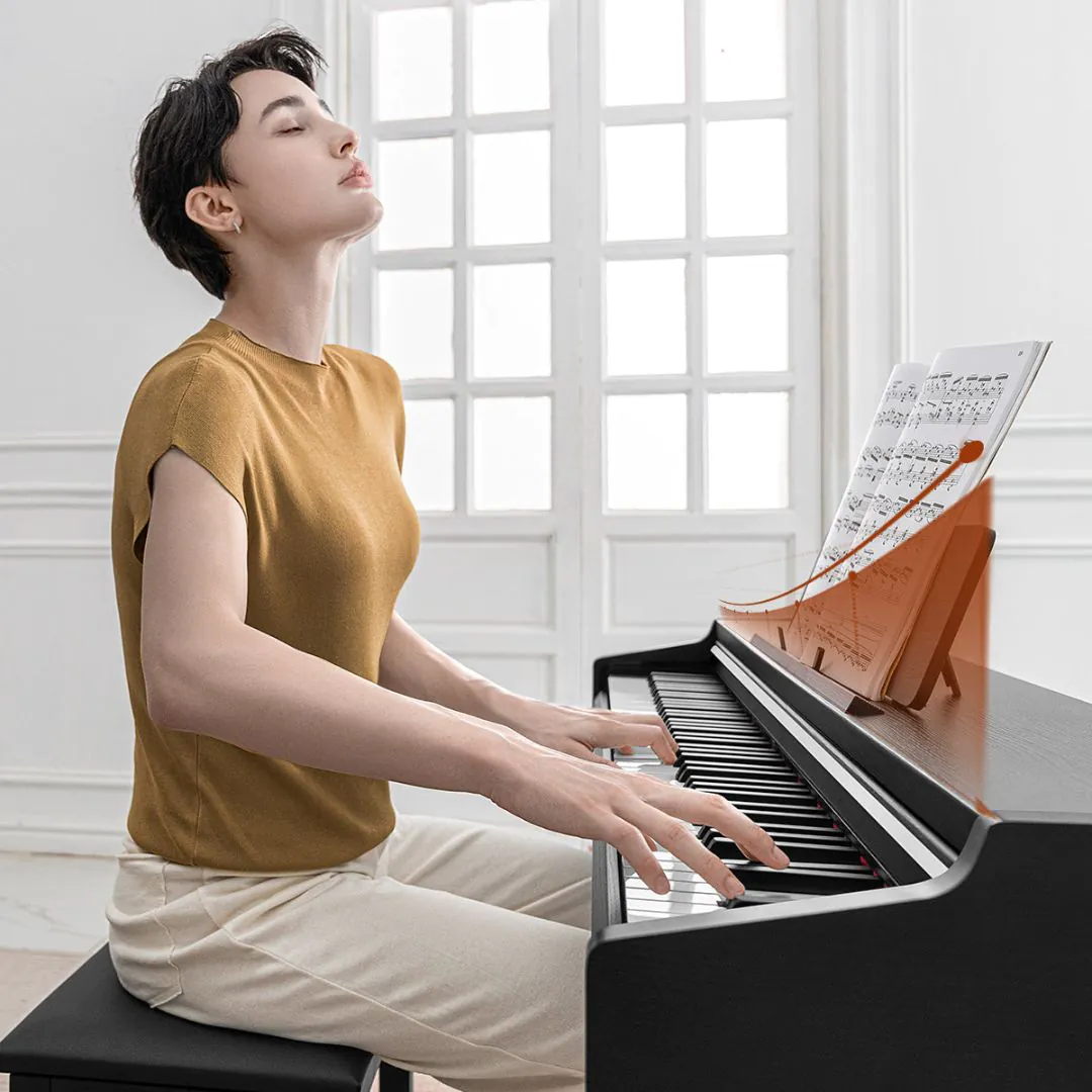 The black cabinet finish adds a contemporary, professional look to any space. Bluetooth MIDI and USB connectivity ensure seamless integration with devices. Designed for home studios, lessons, and living spaces. Combines elegance with advanced functionality. A true all-in-one digital piano solution.