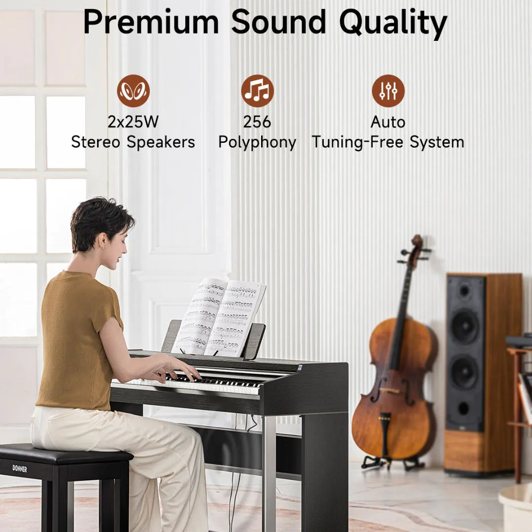 The Donner DDP-200 PRO Digital Piano with Touchscreen – Black is crafted for musicians who want the realism of an acoustic piano combined with advanced digital convenience. Featuring an 88-key graded hammer-action keyboard, it delivers natural resistance and expressive dynamics across the entire range. Four adjustable velocity curves allow players to customize response for practice, performance, or learning, while 256-note polyphony ensures smooth, uninterrupted playback during complex passages.