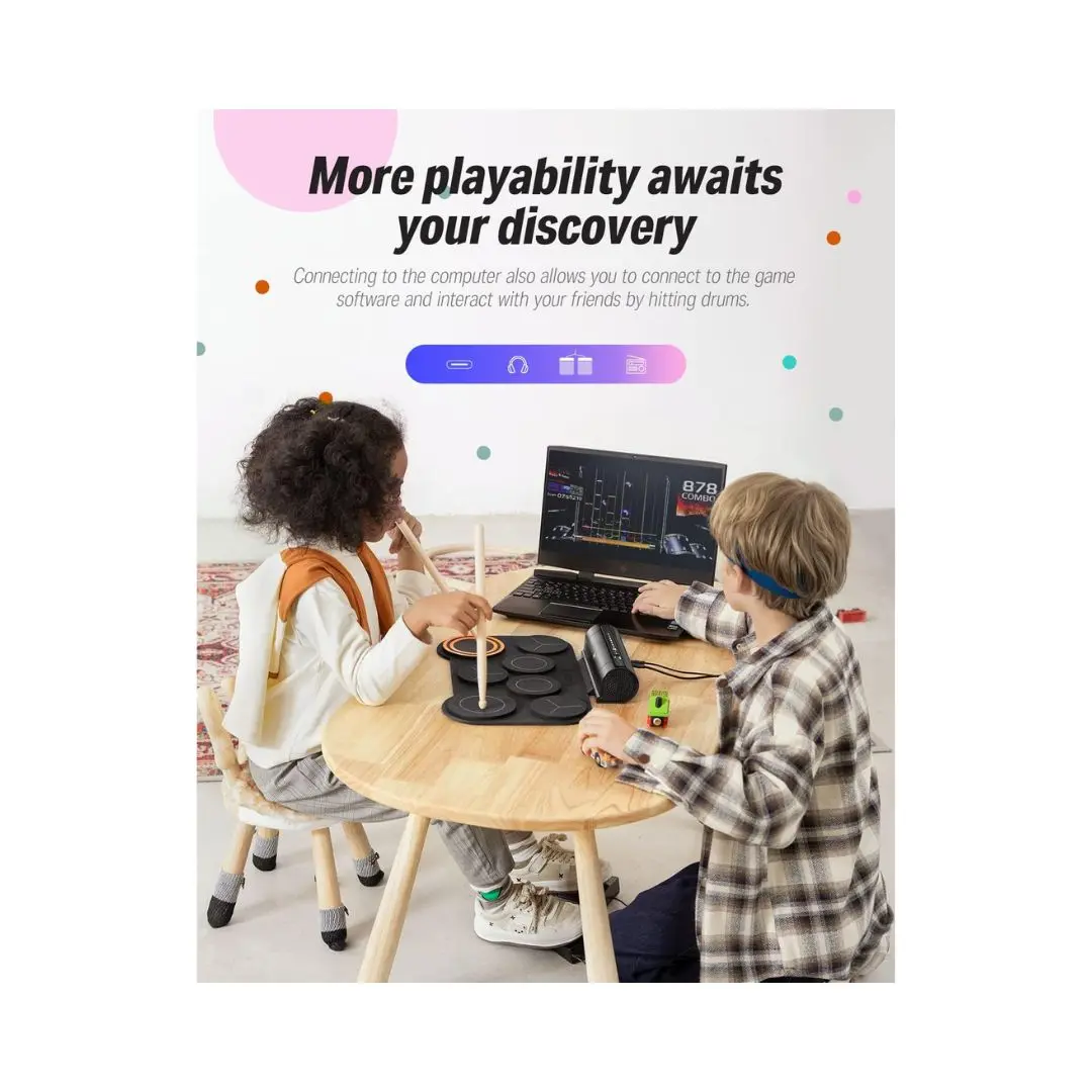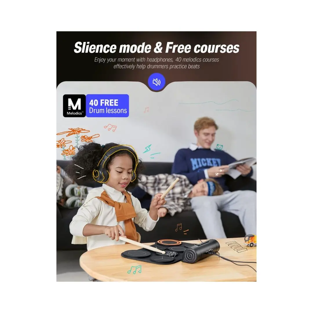 Silent practice is easy thanks to headphone support, allowing you to play without disturbing others. The drum pad also includes external speaker support for casual jam sessions or learning environments. Powered by USB or batteries, it offers flexible power options for home or travel use.