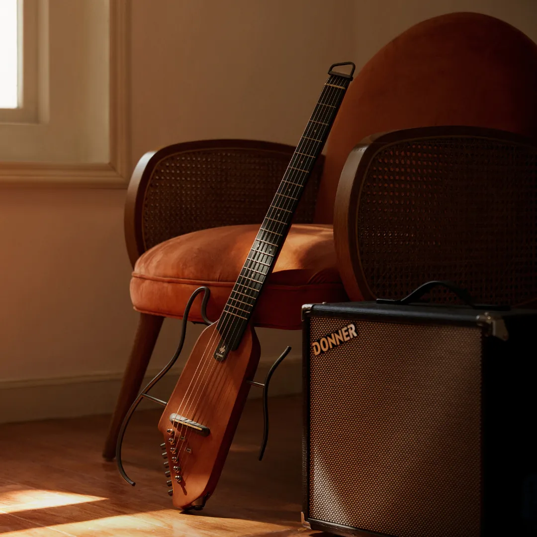 The Donner HUSH-I Acoustic-Electric Travel Guitar combines portability, superior playability, and rich tonal quality in a compact, travel-ready design. Finished in Mahogany Natural, this silent guitar lets musicians play anywhere, whether at home, in studios, or on the go. Its lightweight construction and ergonomic design make it ideal for practice, composition, and live performance without compromising on sound quality.