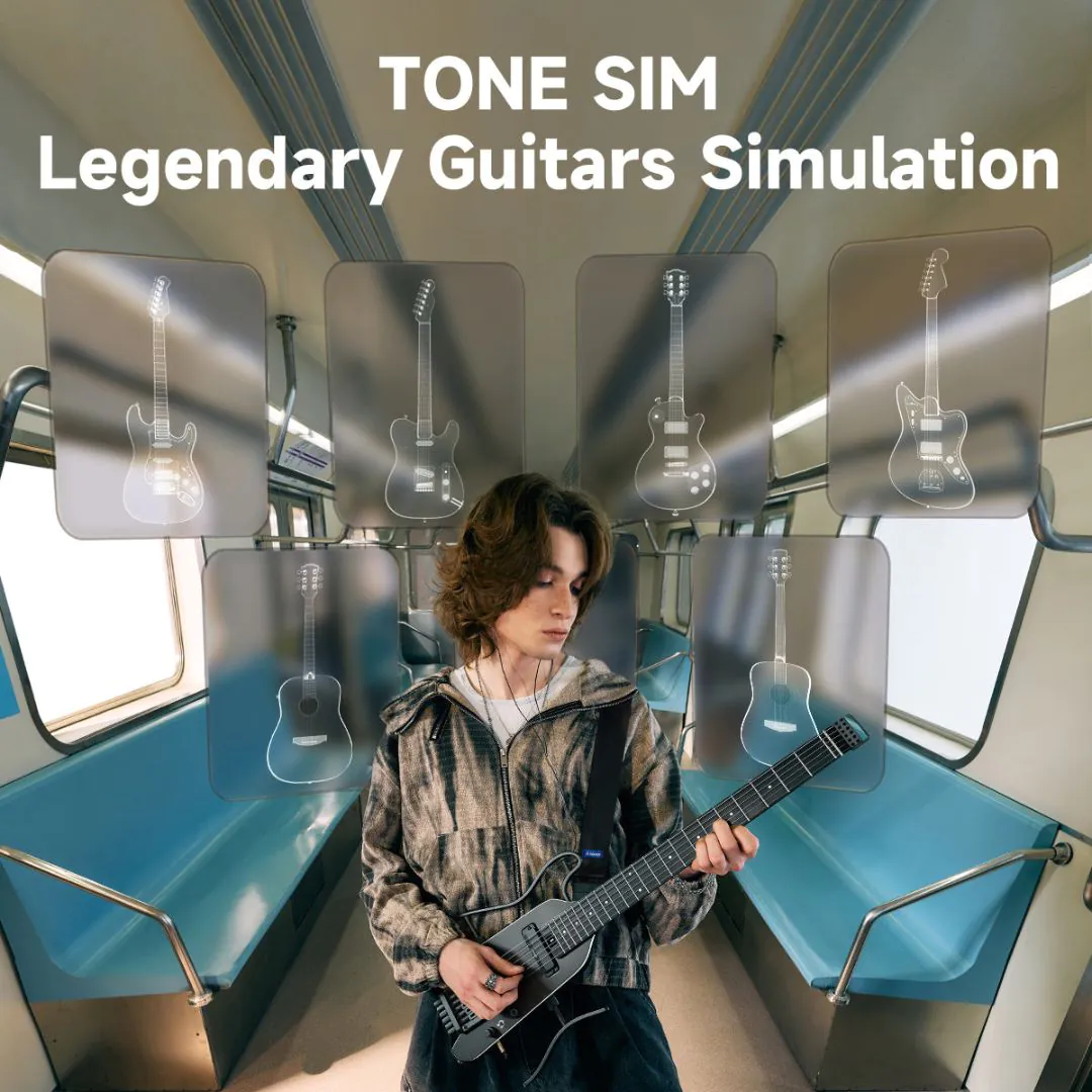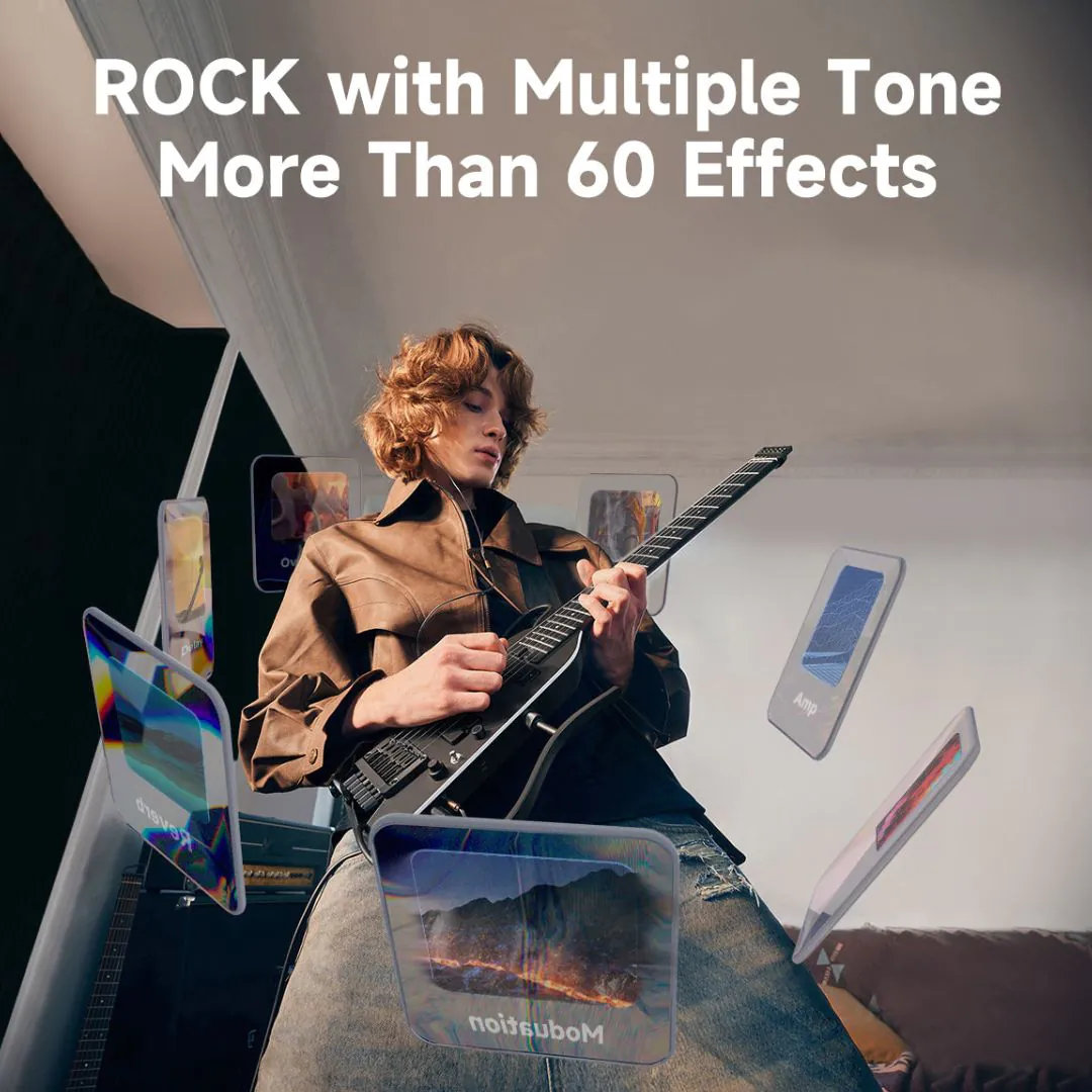 Lightweight headless travel electric guitar with built-in amp modeling, effects, and silent practice features—available now at djcompany.ae.