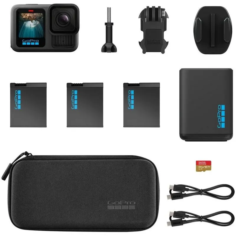 With the Extended Power Bundle, the HERO13 Black comes with extra battery power and accessories — meaning you get extended runtime and fewer interruptions when filming long events, trips, or action sessions.
