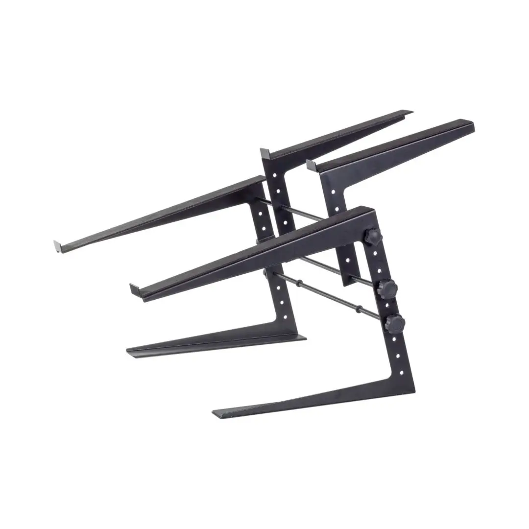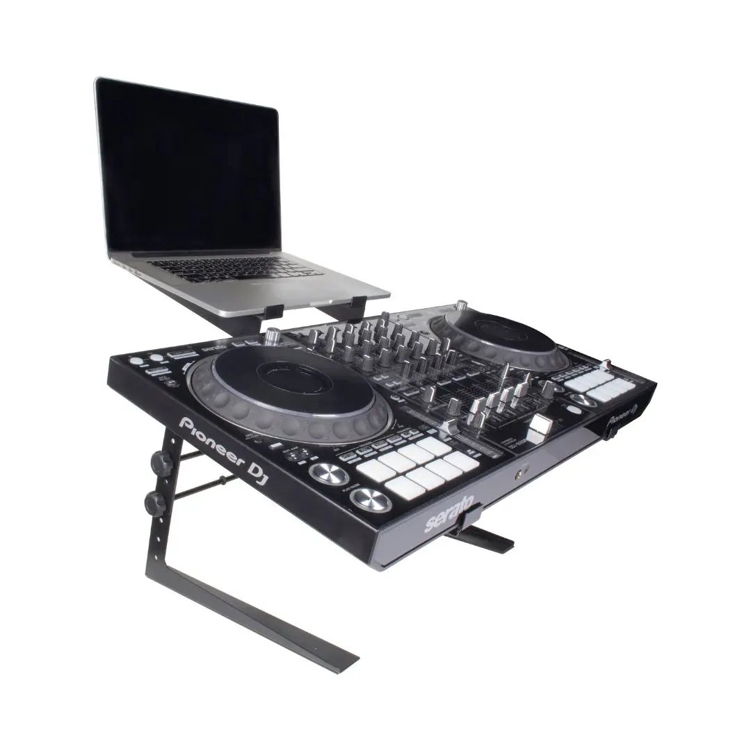 The stand features two spacious shelves that allow you to elevate your DJ controller and laptop, or other gear like small keyboards and pad controllers, helping you keep your setup organized and saving valuable desk or table space.