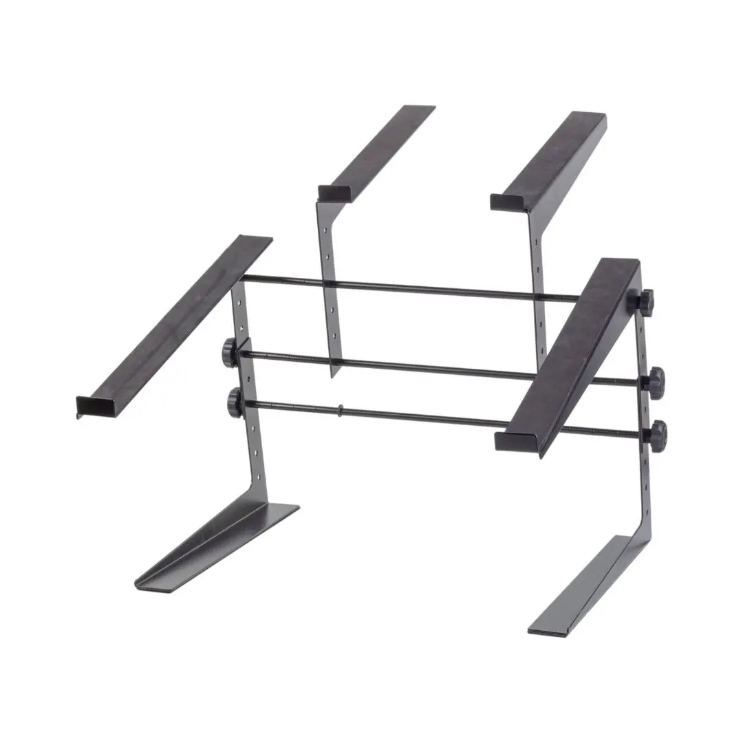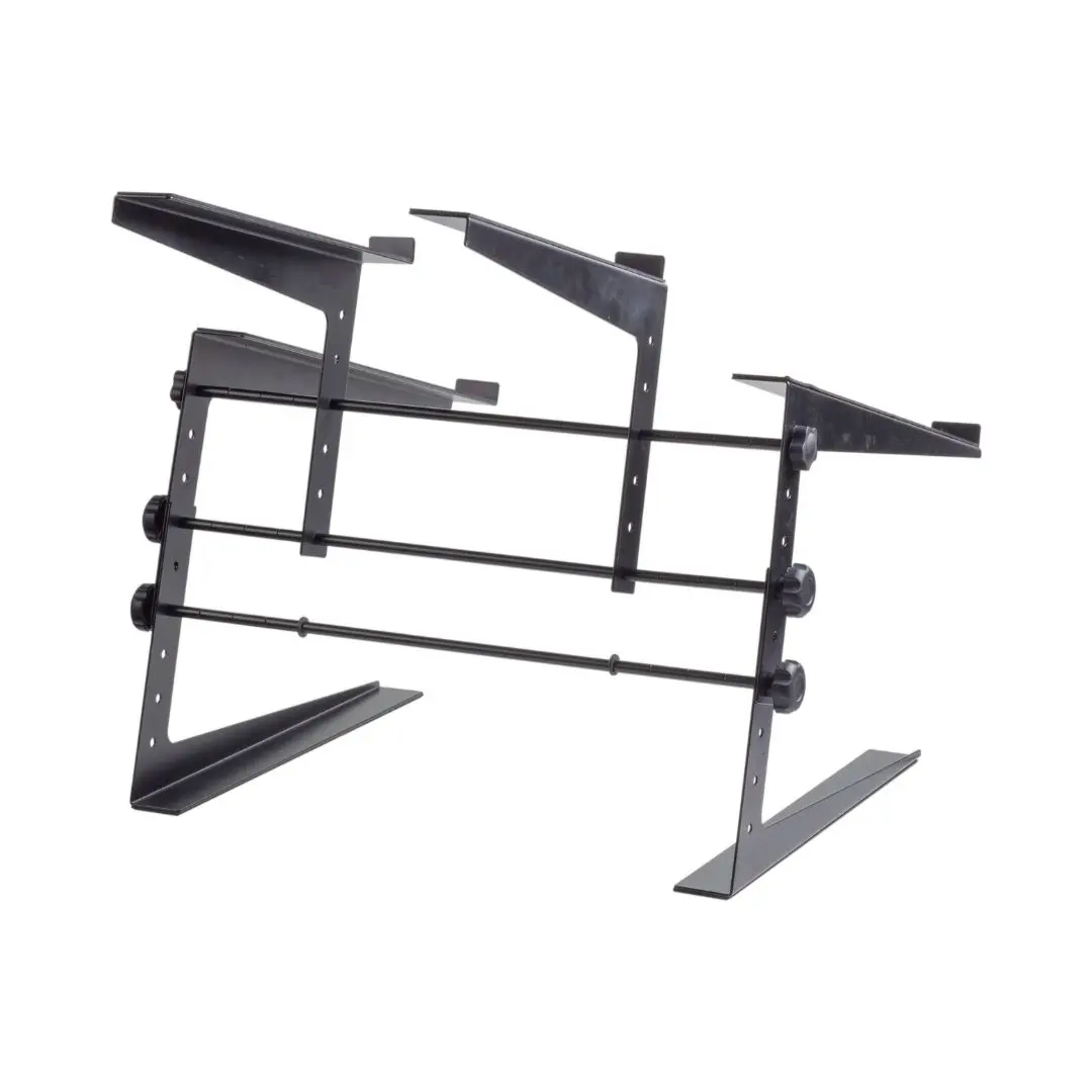 The stand features two spacious shelves that allow you to elevate your DJ controller and laptop, or other gear like small keyboards and pad controllers, helping you keep your setup organized and saving valuable desk or table space.