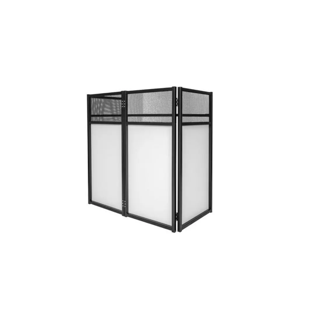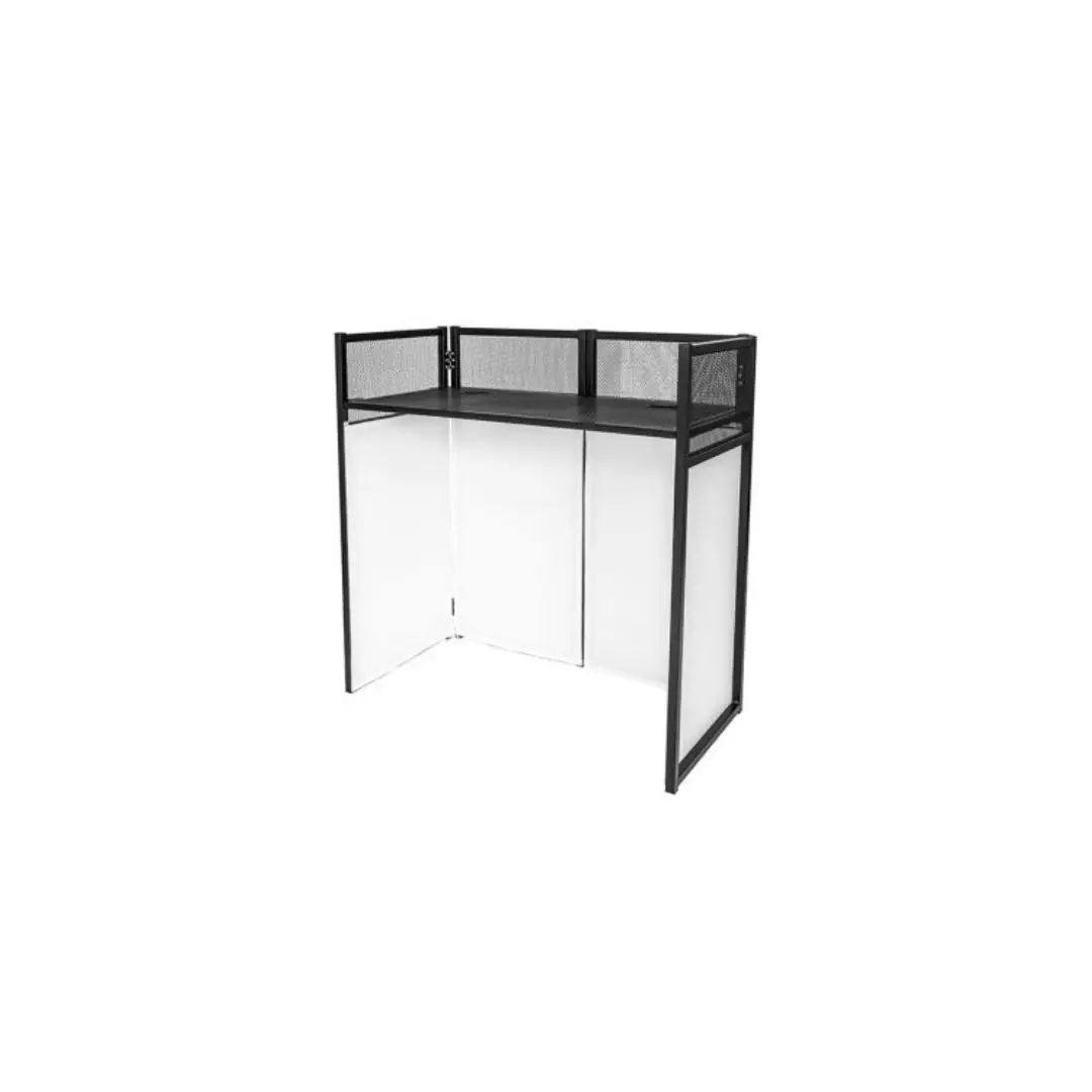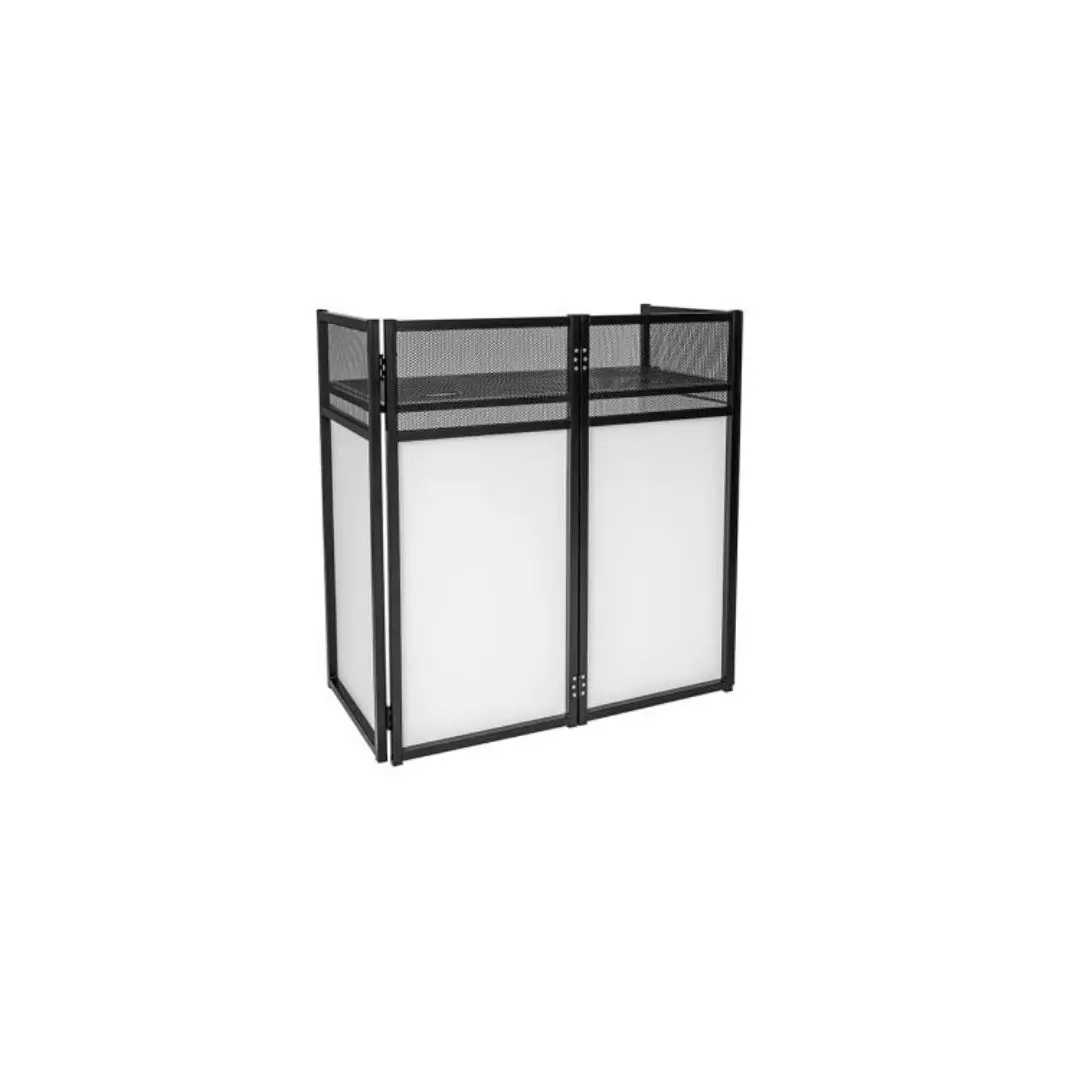 The Headliner Huntington Portable DJ Booth is a compact, foldable DJ workstation with a 4-panel facade, cable management countertop, and washable fire-retardant scrims—perfect for home use or mobile DJs.