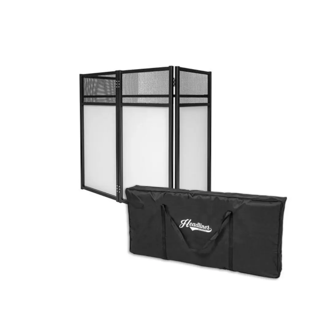 The Headliner Huntington Portable DJ Booth is a versatile and compact workstation designed for both home DJs and mobile performers. Its folding 4-panel facade features a sturdy black metal frame and includes interchangeable black and white scrims made from washable, fire-retardant Lycra, offering a professional look for any event. The booth also includes a mesh countertop for seamless cable management, keeping your setup tidy. Locking pins ensure stability during performances, while tool-free assembly allows you to set up in minutes. Lightweight and portable, the Huntington comes with a convenient carrying bag, making it easy to transport and deploy wherever your gig takes you.