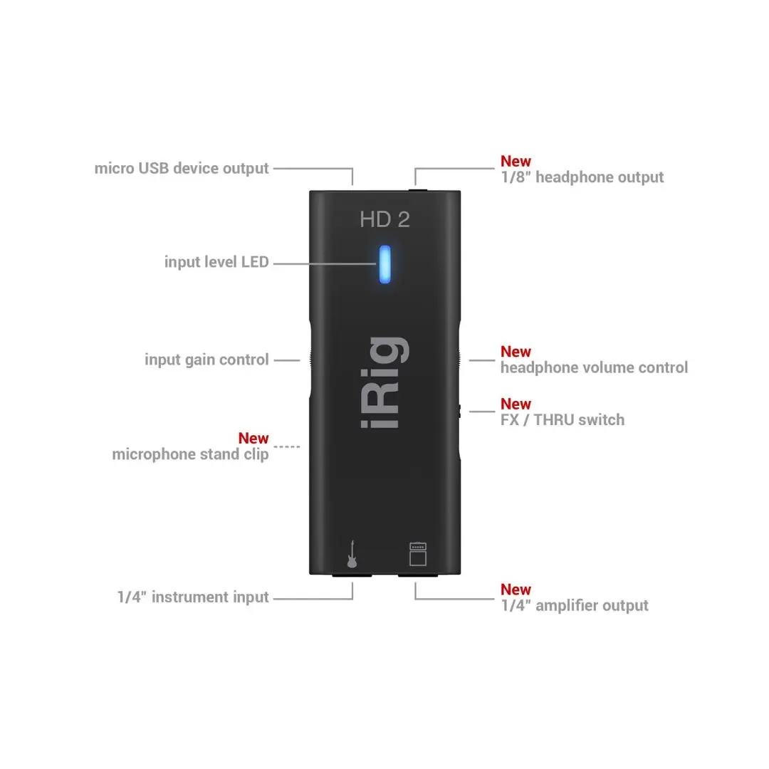 With its Hi-Z instrument input, the iRig HD 2 captures the true tone of your guitar or bass while maintaining low noise and excellent dynamic response. The device features a dedicated Amp Out jack with FX/Thru switching, allowing you to send either processed tones from apps or a clean signal directly to an amplifier or stage setup.