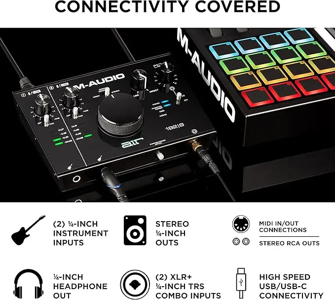 The interface also comes bundled with professional recording software, virtual instruments, and effects to help users start producing immediately. Whether you are recording vocals, instruments, or podcasts, the M-Audio AIR 192|8 provides reliable performance and professional sound quality.