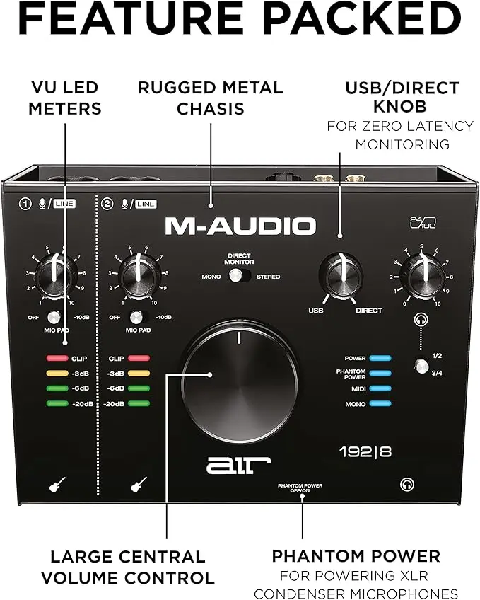 The M-Audio AIR 192|8 is a professional USB audio interface featuring 24-bit/192 kHz recording, dual Crystal™ preamps, multiple monitoring options, and rugged construction, ideal for music production and studio recording.Home