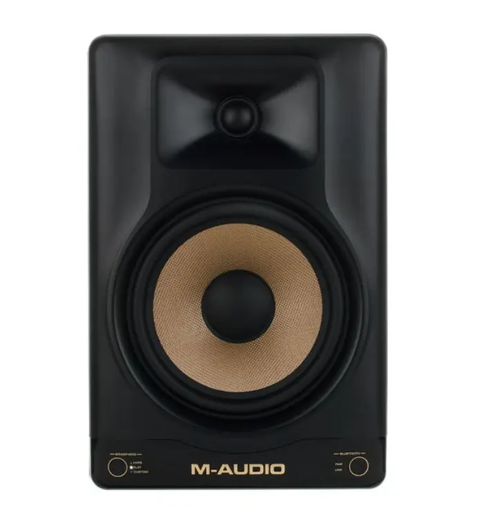 The monitor includes integrated DSP processing with selectable listening modes such as Flat, Hype, and Custom. These presets allow users to switch between reference monitoring and enhanced listening profiles. The M-Audio Studio Control App also allows detailed EQ adjustments to optimize sound based on room acoustics.