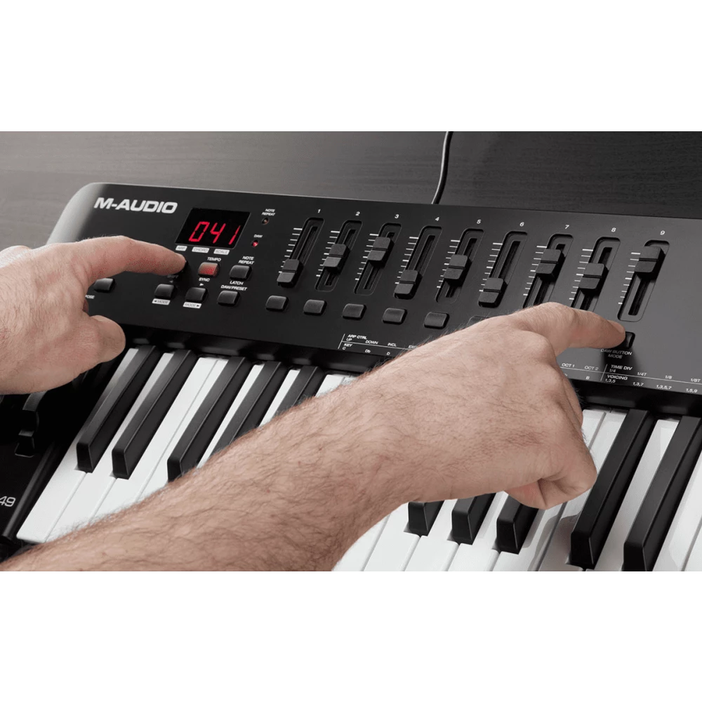 The M-Audio Oxygen 49 MKV features 49 full-size velocity-sensitive keys designed for expressive performance and accurate MIDI response. Its professional layout and responsive keybed make it suitable for studio production, songwriting, and live performances, giving producers precise control over virtual instruments and plugins.
