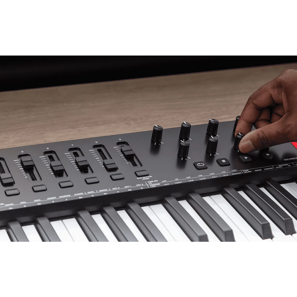 The built-in arpeggiator includes multiple modes and timing controls, adding rhythmic creativity to performances. Dedicated DAW transport buttons provide direct access to recording, playback, and navigation functions, improving production workflow efficiency. The Oxygen 49 MKV supports major DAWs including Ableton Live, Pro Tools, Logic Pro, Cubase, and MPC Beats.