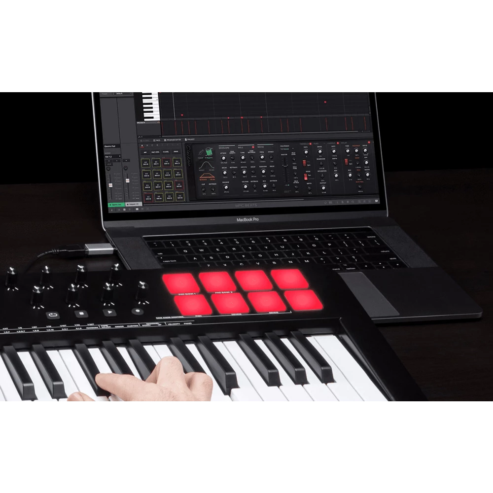 Connectivity is simple with USB-MIDI plug-and-play functionality for Windows and macOS. The keyboard is USB powered and includes a sustain pedal input for expressive playing. A professional software bundle including Ableton Live Lite, MPC Beats, AIR virtual instruments, and production tools helps users start creating immediately.
