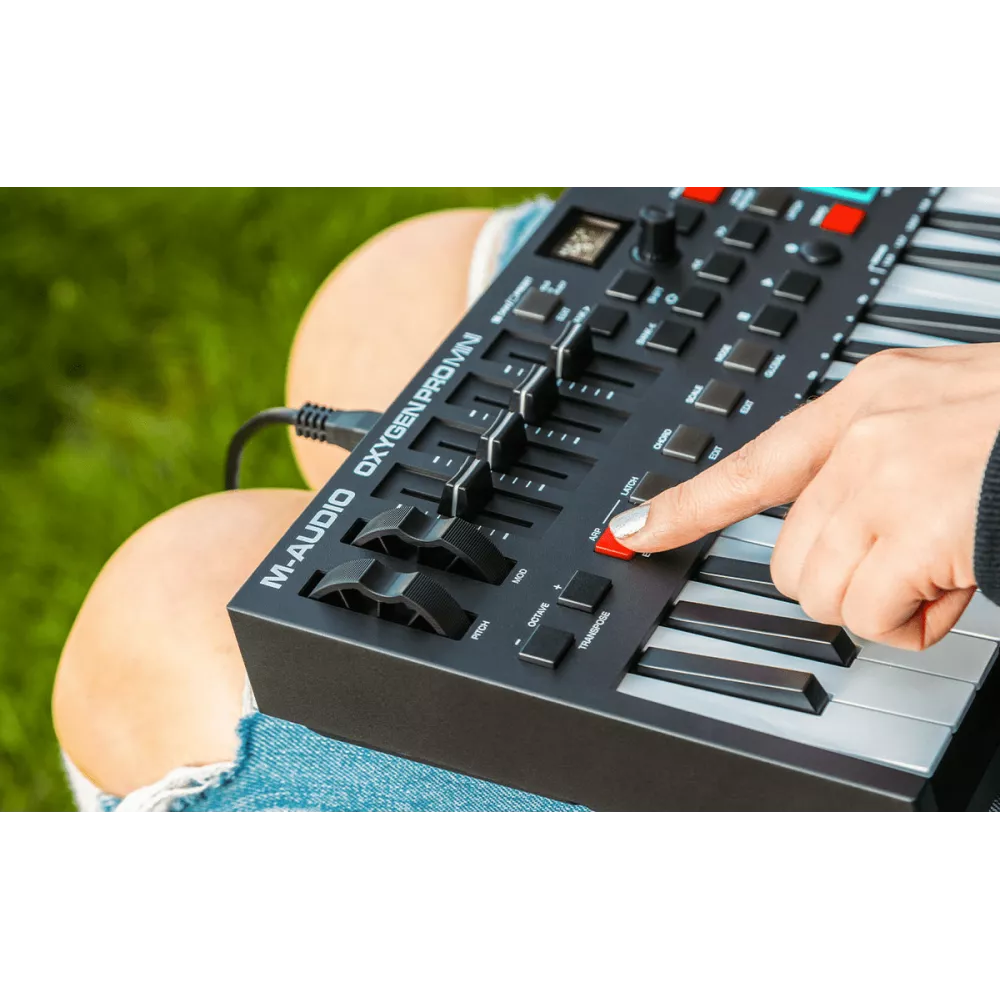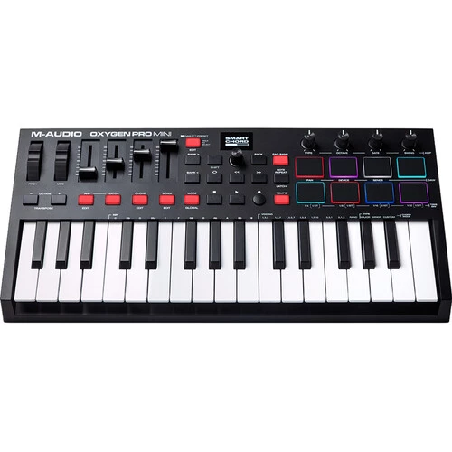 The M-Audio Oxygen Pro Mini is a 32-key portable USB MIDI controller featuring RGB pads, Smart Chord and Smart Scale functions, assignable controls, and seamless DAW integration, making it ideal for mobile music production and beat creation.Home