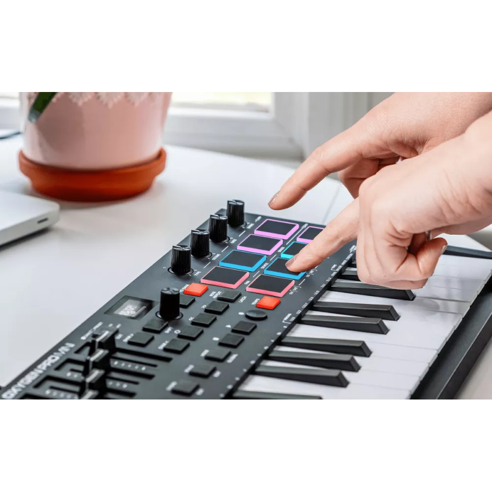 The Oxygen Pro Mini features 32 velocity-sensitive mini keys with aftertouch, offering expressive playability in a space-saving design. It also includes 8 RGB backlit velocity-sensitive performance pads with Note Repeat functionality, making it ideal for finger drumming, launching clips, and triggering samples.