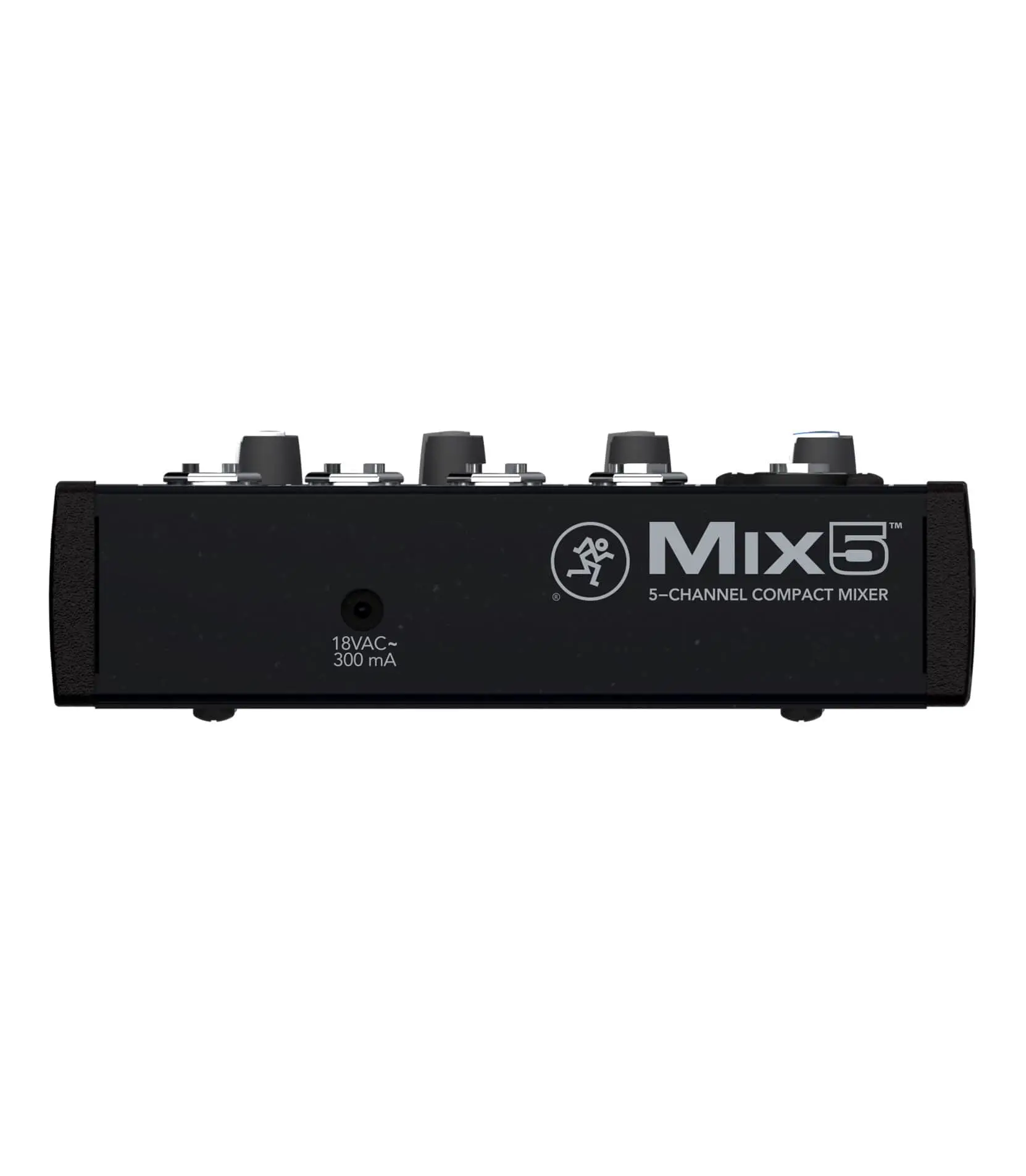 The Mackie Mix5 is a 5-channel compact analog mixer with a rugged metal chassis for reliable sound reinforcement. Features 1 mic/line input with phantom power and 2-band EQ, plus two stereo line inputs each with 3-band EQ. Ideal for home studios and small live setups.