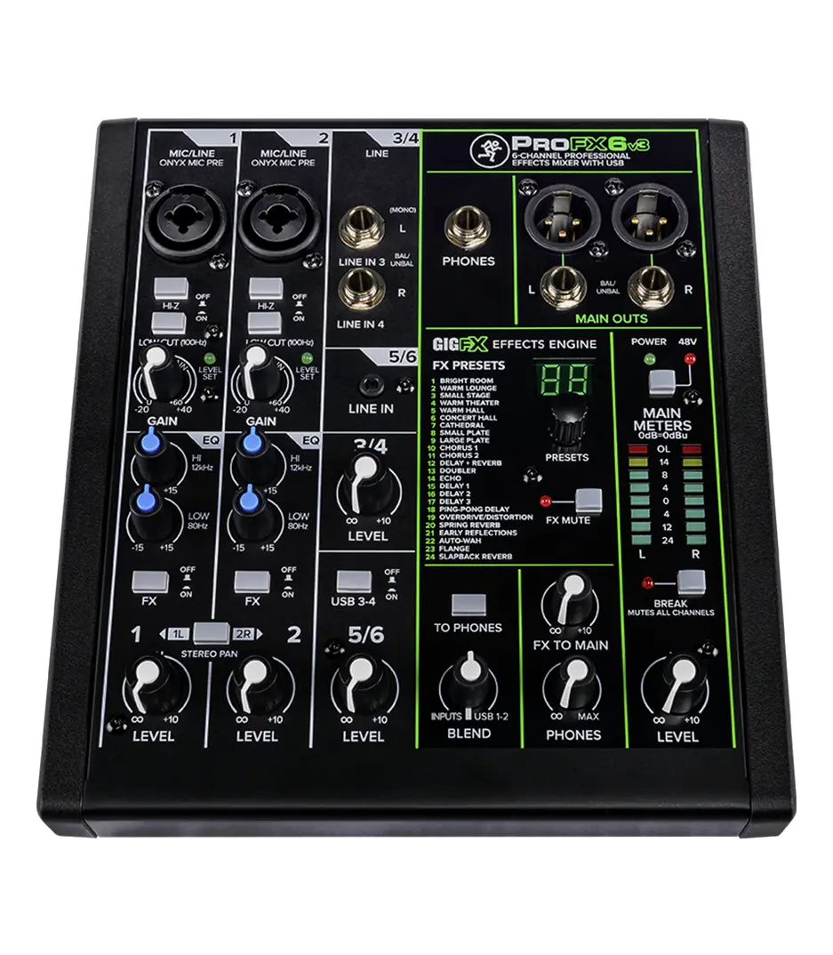 The Mackie ProFXv3 Series is an affordable professional analog mixer with Onyx preamps (60dB headroom), 24 GigFX™ effects, and 24-Bit/192kHz 2×4 USB recording. Ideal for live, home recording, and content creation with included Pro Tools | First/Waveform OEM software.