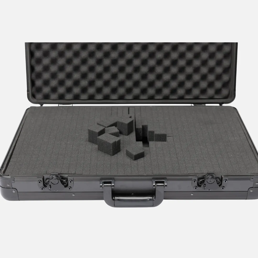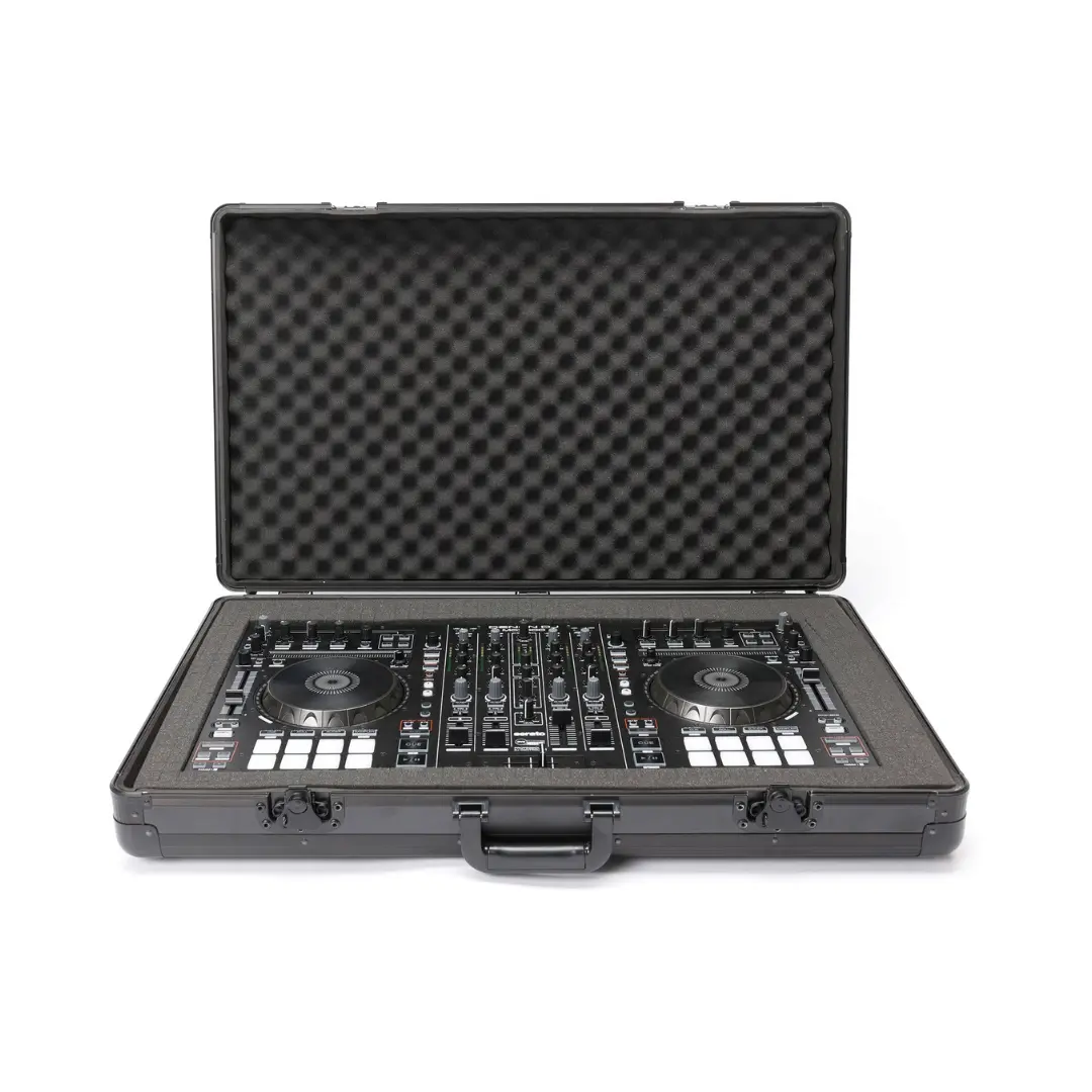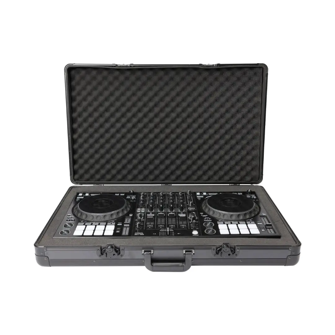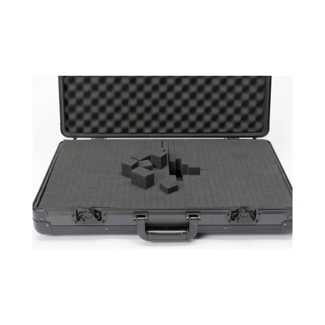 Inside, the foam system consists of two separate layers that can be shaped to accommodate popular DJ controllers, laptops, mix gear, cables, and smaller accessories — keeping everything secure and organized. Its ergonomic carry handle offers easy transport between gigs, rehearsals, and studio sessions, while the black matte finish provides a sleek, professional look.