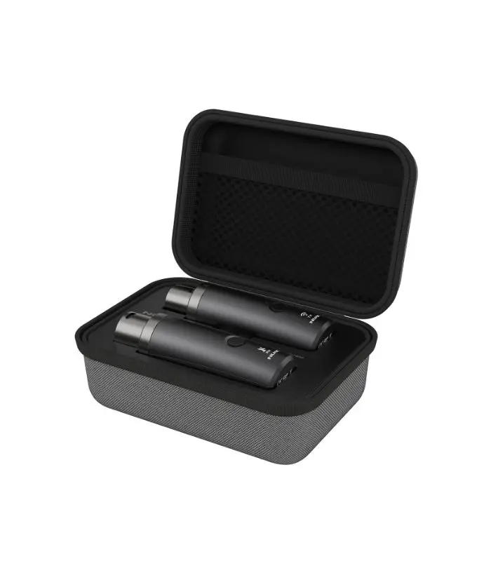 The compact charging case stores and recharges both transmitter and receiver, ensuring extended usage and convenience without disposable batteries.