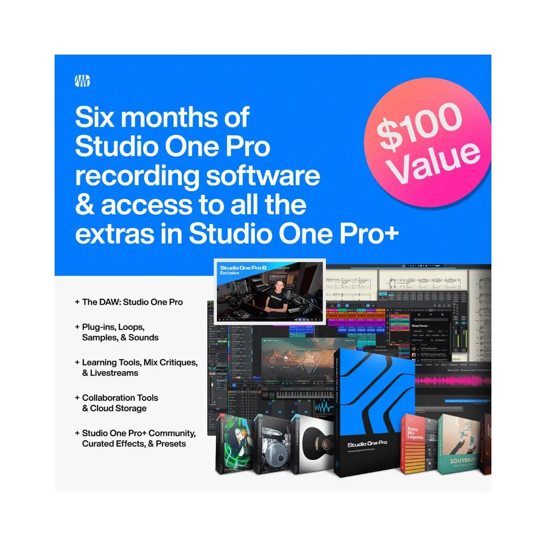 This all-in-one bundle includes the M7 condenser microphone, HD7 monitoring headphones, and 6 months of Studio One Pro+ access. Whether you're producing music or podcasts, it provides the tools needed for professional-quality recordings right out of the box.