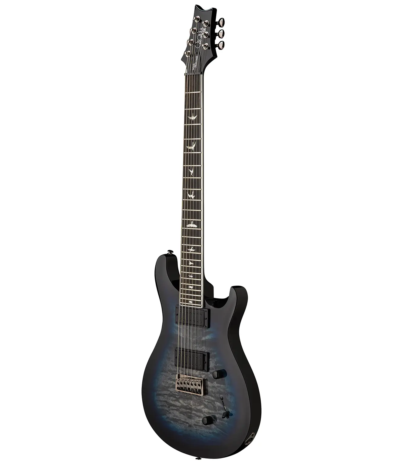 With a string-through plate-style 7-string bridge, 3-way pickup selector, black hardware, and a PRS deluxe gig bag included, this guitar provides professional features at an SE price point. Its Holcomb Blue Burst finish and quilted maple veneer complete the sleek, stage-ready look.
