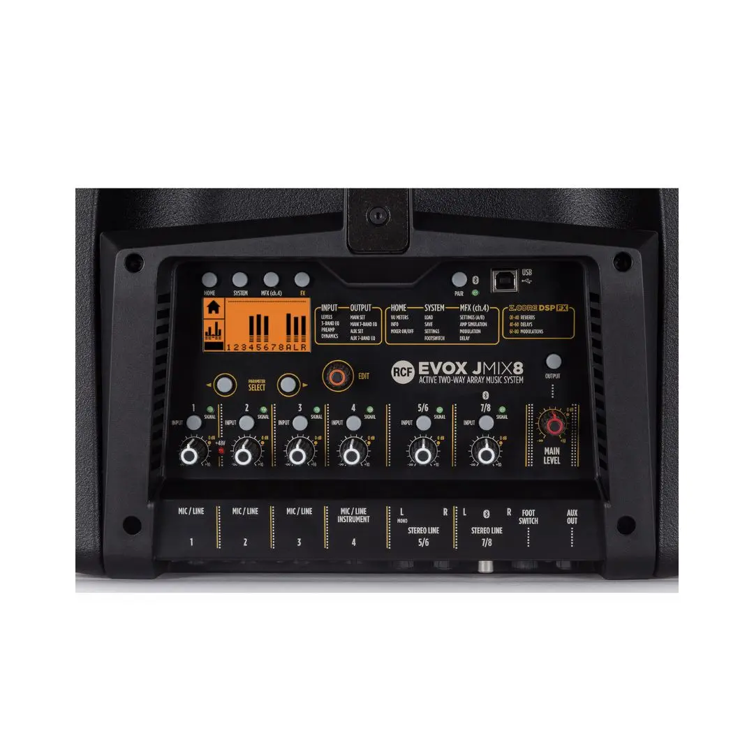 The RCF EVOX JMIX8 is a high-performance 1400W portable line array PA system with an 8-channel digital mixer, onboard effects, and Bluetooth control. Perfect for live performers, DJs, and audio professionals, it delivers clear, powerful sound in a compact, portable design.