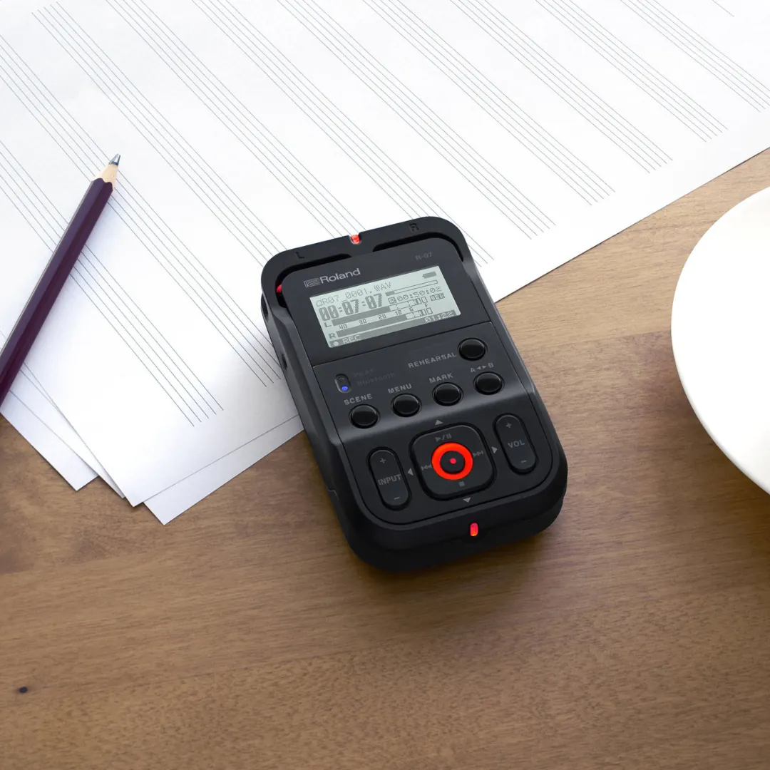 The Roland R-07 Portable Audio Recorder (Black) is a stylish, ultra-compact recorder with high-resolution WAV/MP3 capture, Bluetooth remote control and monitoring, Hybrid Limiting and Dual Recording safety features, and long battery life — ideal for musicians, journalists, and creators capturing audio anywhere.Home