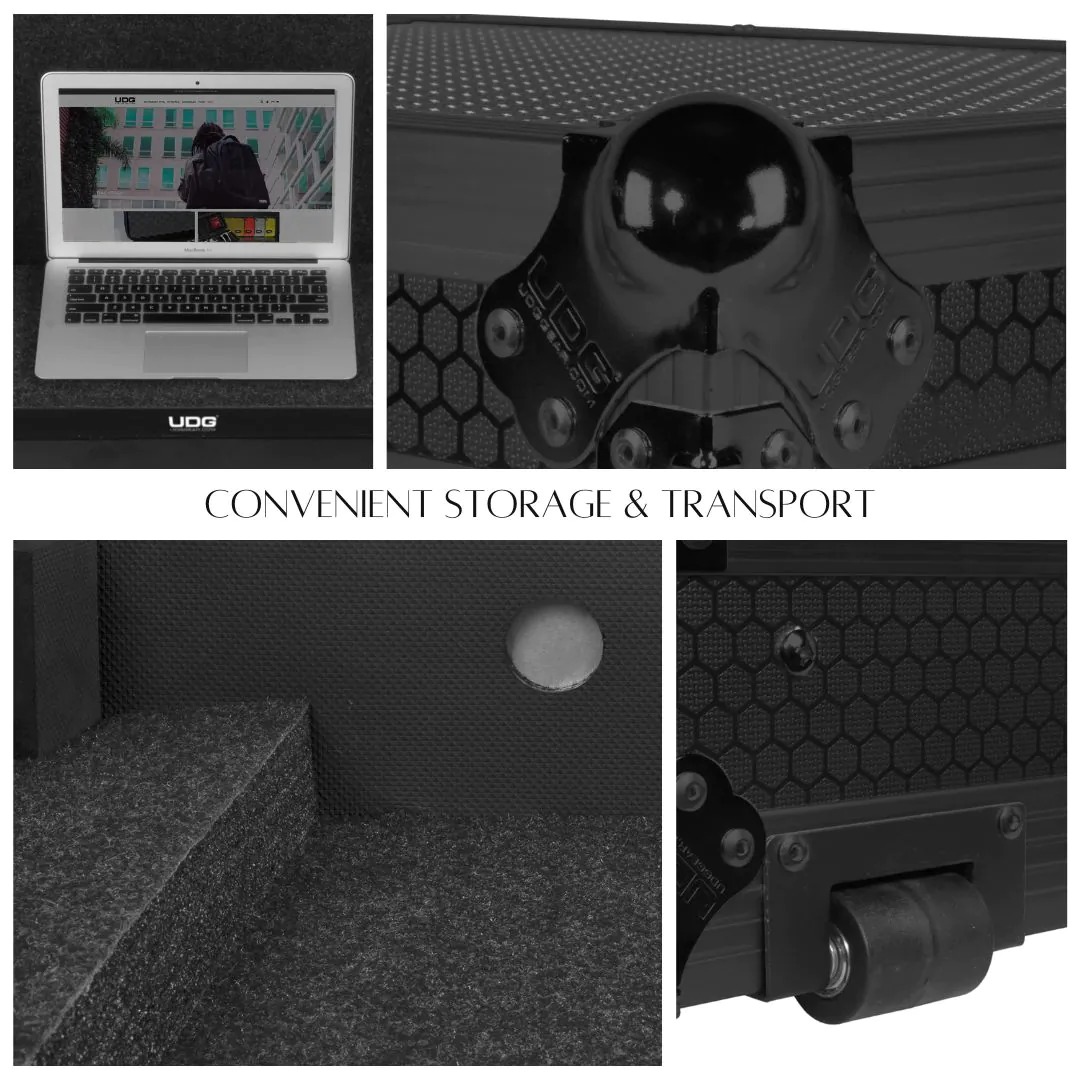 | Extras | 80 mm rear space for connections & PSU storageBlack laminated finish with honeycomb/hexagonal “Stage Grip” patternHigh-grade aluminium UDG logo plateUDG heavy-duty spring-loaded handlesCable access hole with removable UDG emblem coverRoller wheels with in-line skate bearingsRemovable front access panelAdjustable laptop shelf |