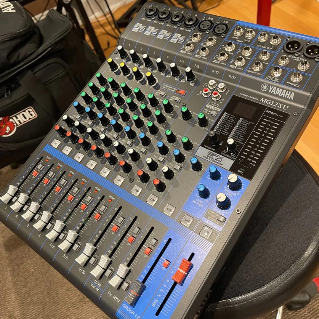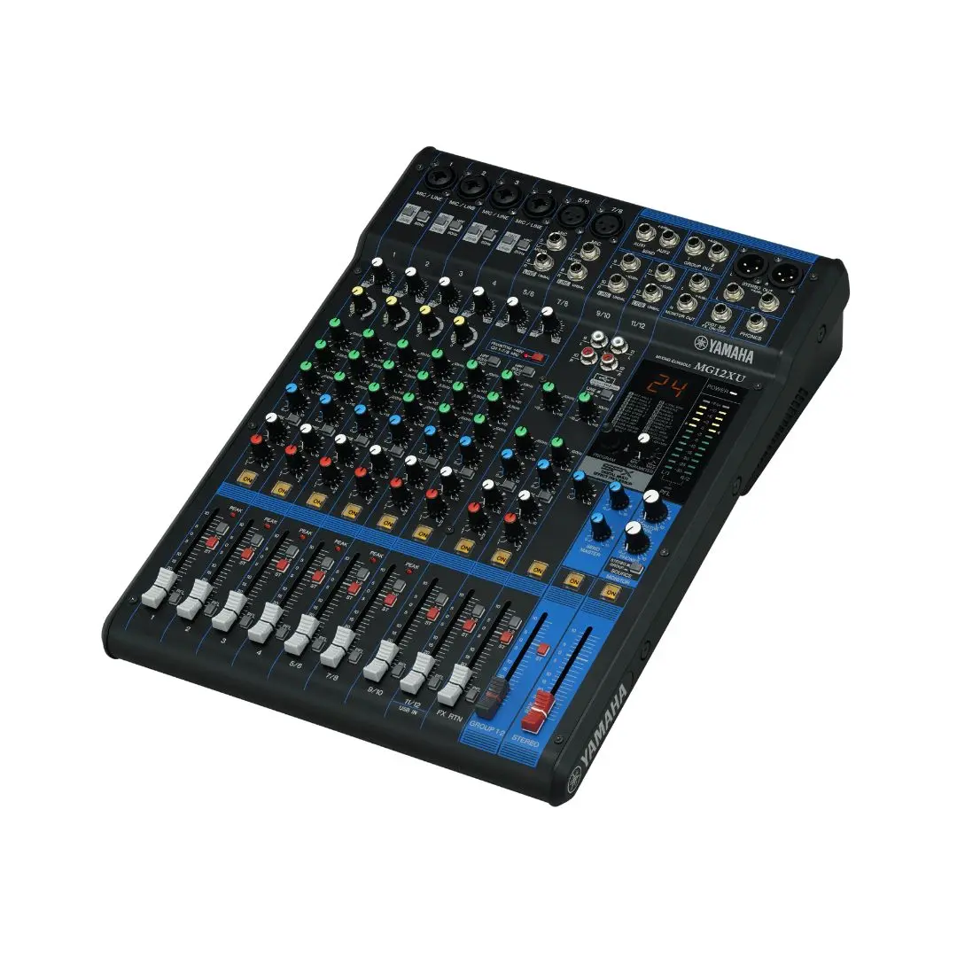The Yamaha MG12XU is a professional 12-input analog mixer designed for live sound, recording, and streaming applications. It features D-PRE mic preamps, SPX digital effects, intuitive EQ control, and a high-resolution USB interface, delivering clean audio performance in a compact and durable design.